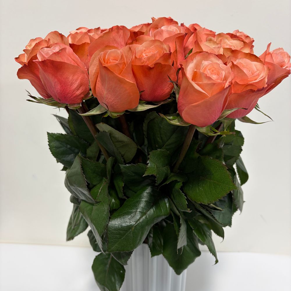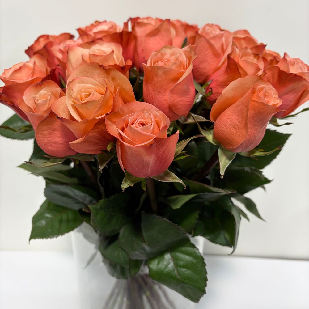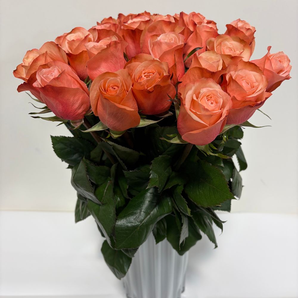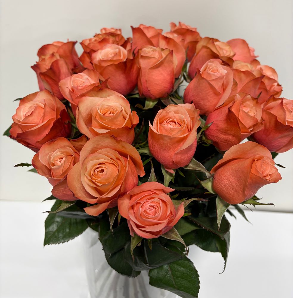 25 stems of coral fresh cut roses tied up in lace bow. Customization available.