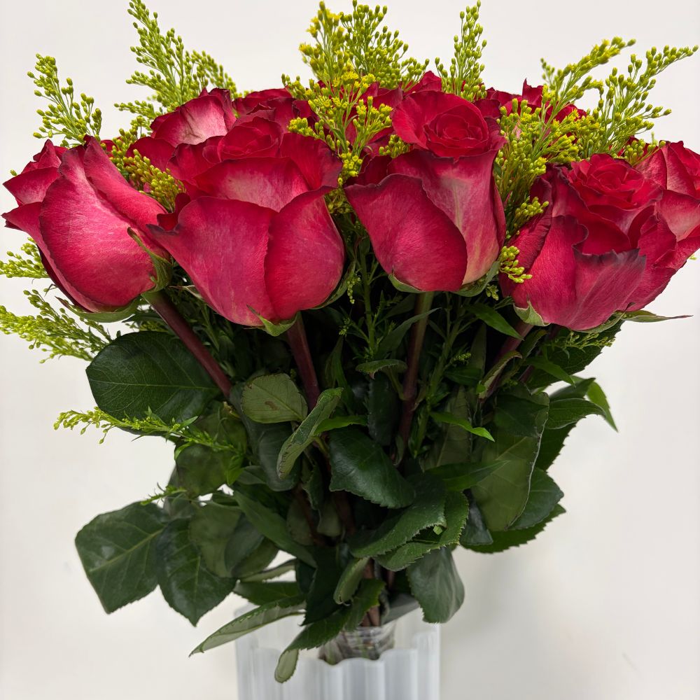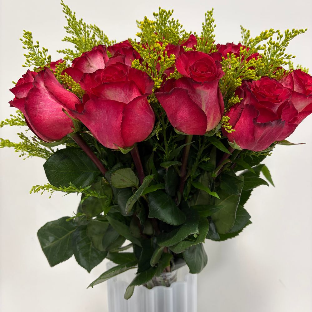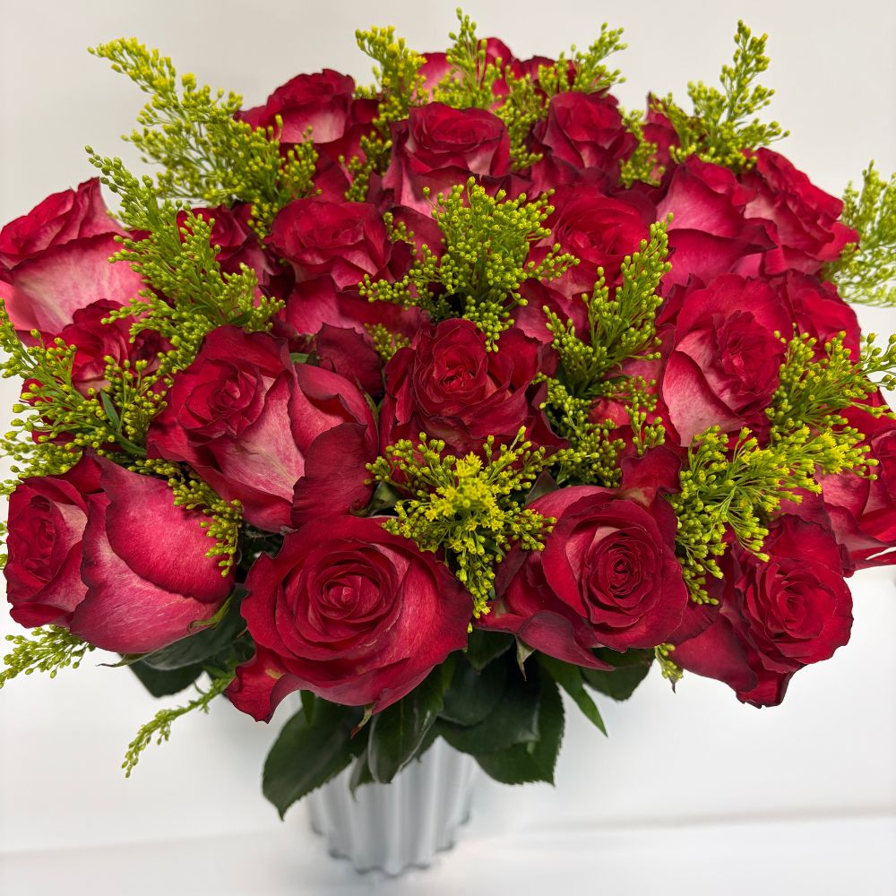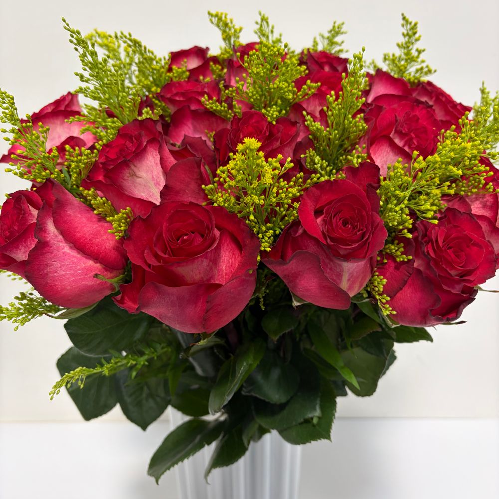 Bouquet of red flush roses 25 stems tied up with lace bow. Customization available.