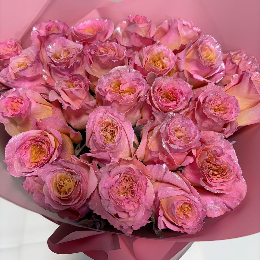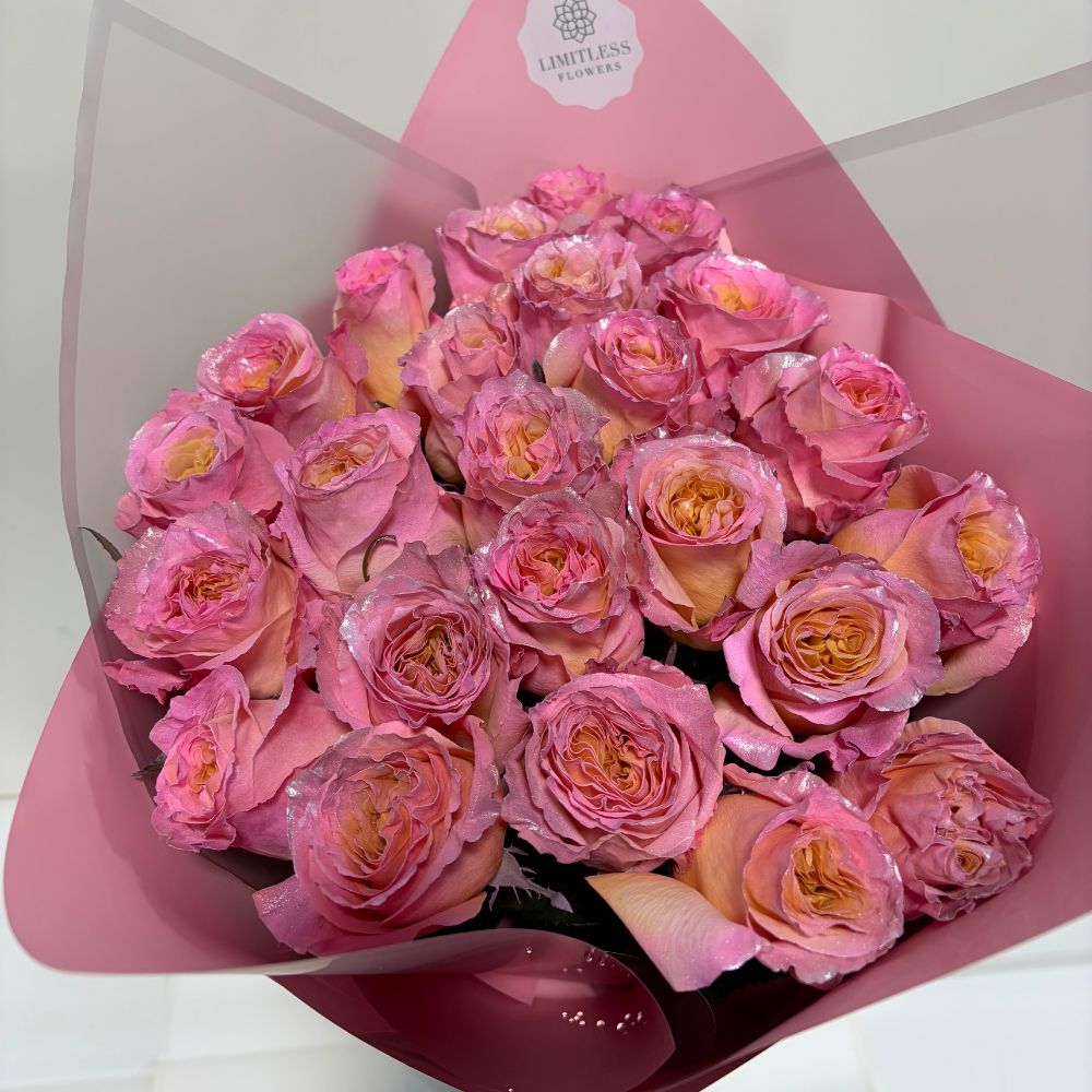 Bouquet of shiny pink tint roses, 25 stems wrapped in paper and lace bow. Customization available