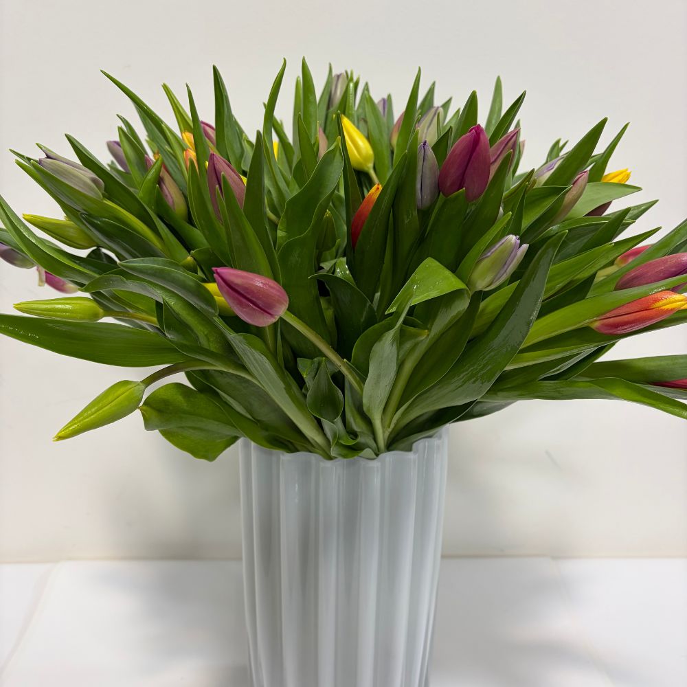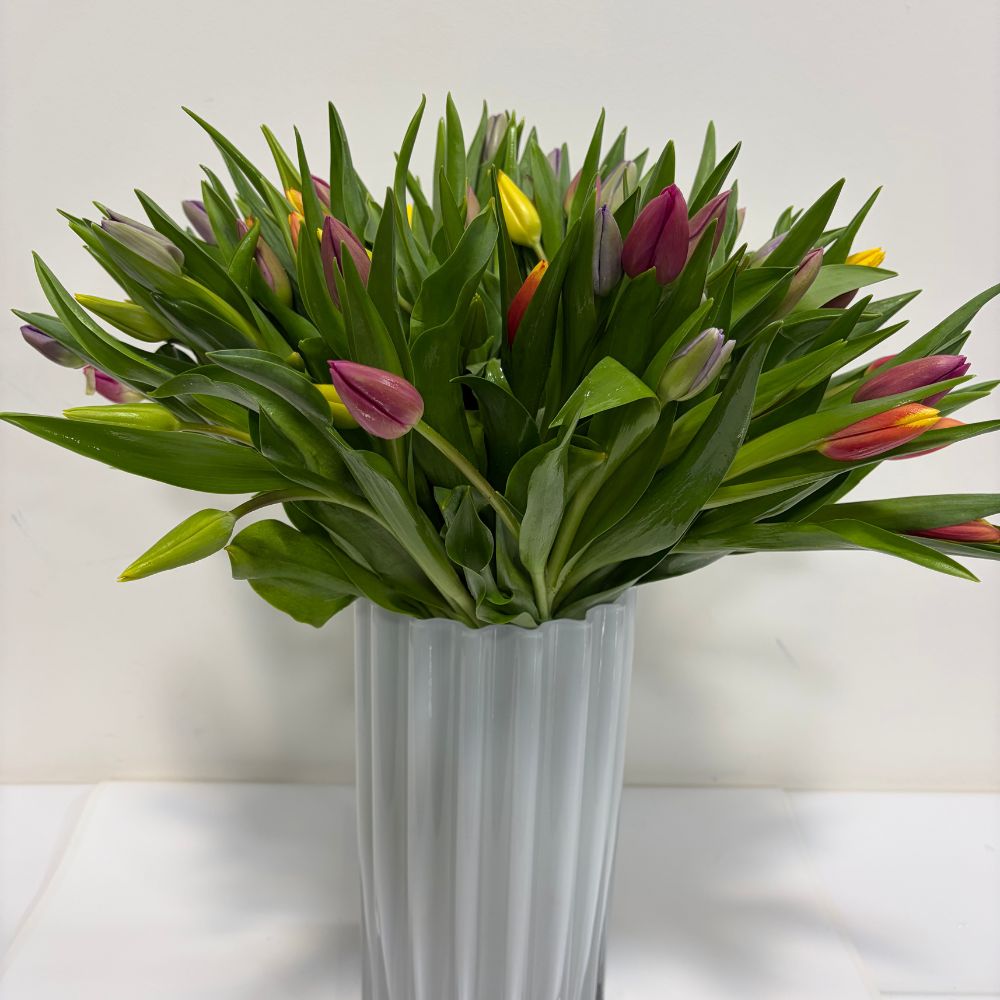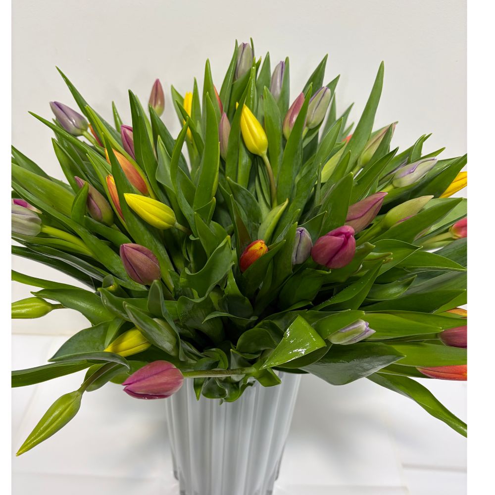 Four bunches of colorful tulips. Each bunch contains 15 stems, in total 60 stems. Customization available Vase available for 40$