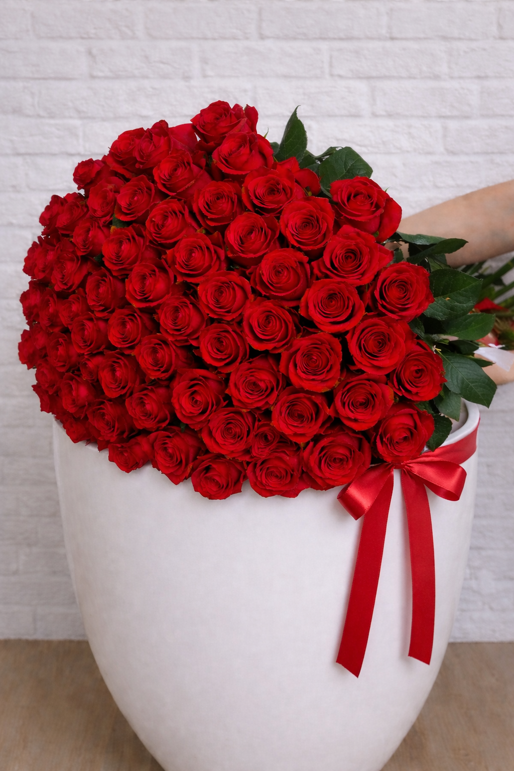 75 Stems of fresh red roses tied up with red lace bow. For customization please call.
